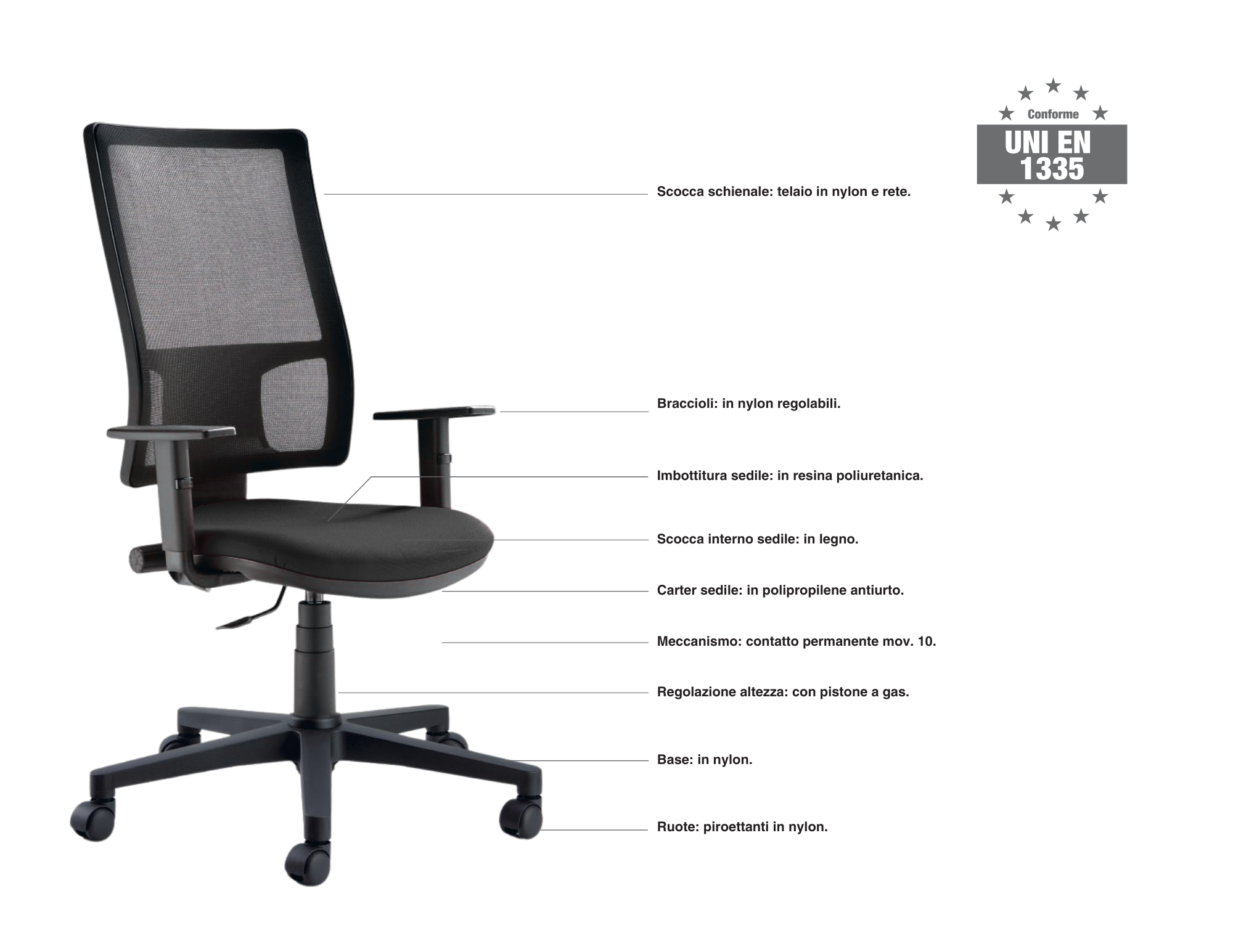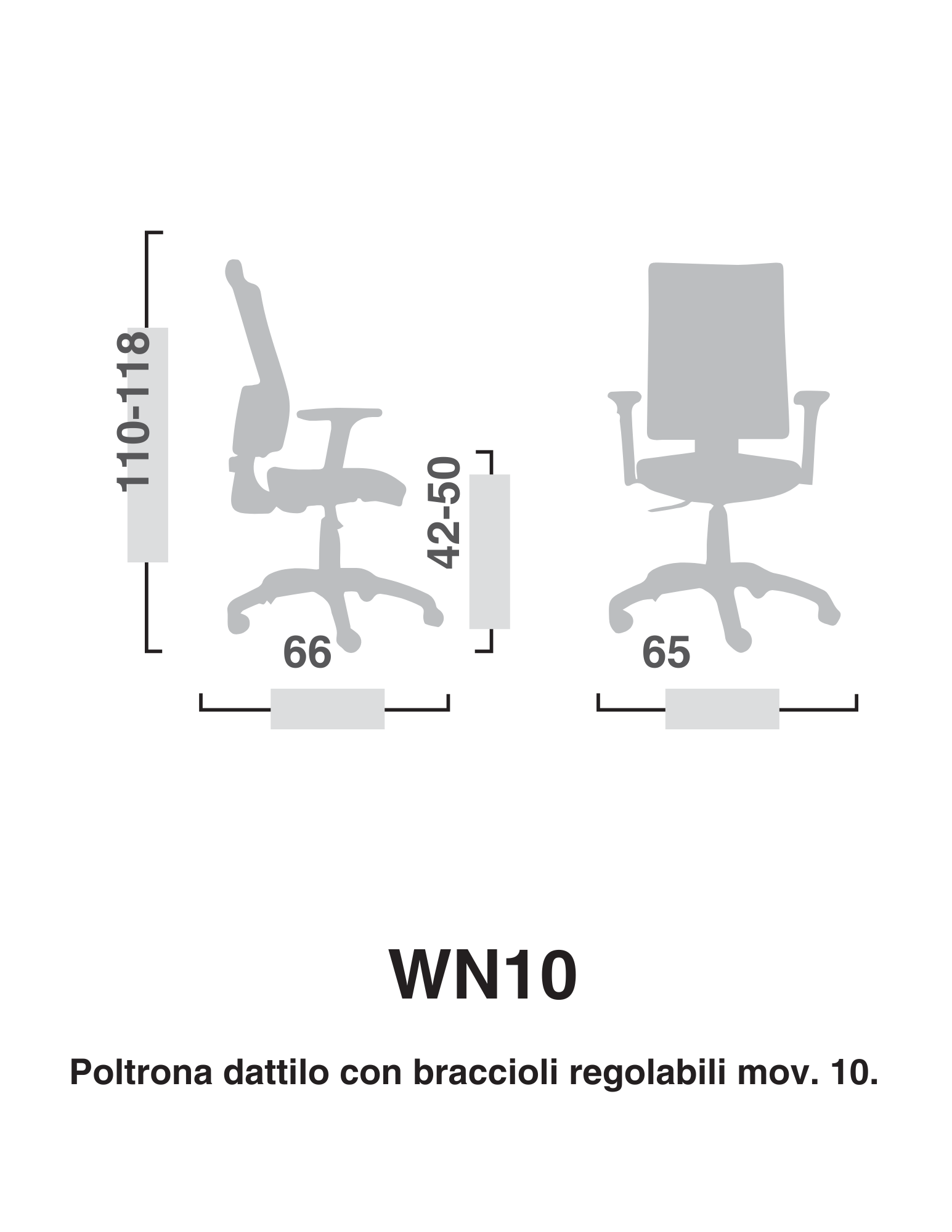 La Poltrona WN10 WING rappresenta la soluzione ideale per ambienti lavorativi che richiedono comfort e conformità normativa. Dotata di schienale alto regolabile in altezza a contatto permanente secondo il D.L. 81/2008, garantisce il massimo supporto ergonomico durante le lunghe giornate di lavoro. La struttura combina telaio in nylon antiurto con rivestimento in rete nera traspirante, mentre il sedile è realizzato con carter in poliuretano antiurto e imbottitura in poliuretano espanso ad alta densità per un'accoglienza ottimale. La regolazione pneumatica mediante pompa a gas consente un'altezza del sedile variabile da 42 a 50 cm, mentre lo schienale si adatta da 110 a 118 cm. Braccioli regolabili in altezza e base a 5 razze con ruote a doppio battistrada completano una seduta professionale e stabile. Dimensioni: L. 66 x P. 65 cm.